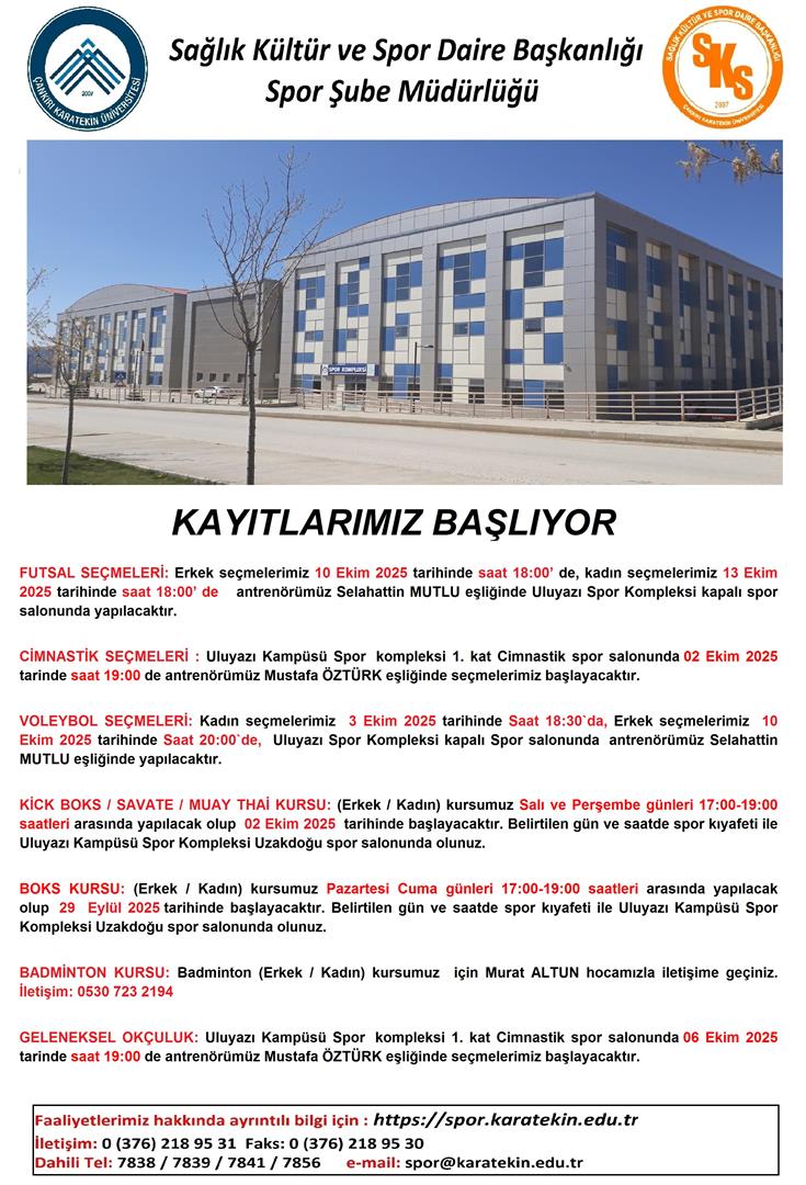 Adres: Uluyazı Kampüsü Sağlık Kültür ve Spor Daire Başkanlığı Spor Kompleksi